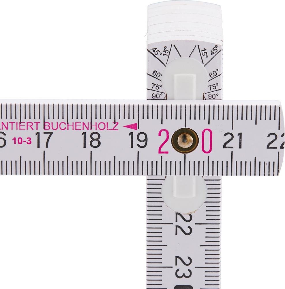 • Durch die eingelassenen Gelenke entsteht im ausgeklappten Zustand eine durchgehend gerade Kante, der Maßstab ist so auch als Lineal für eine durchgezogene Anreißlinie zu verwenden