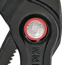 KNIPEX Cobra® QuickSet Ganz öffnen, zuschieben, zupacken!. Zusätzliche Schnelleinstellung an das Werkstück durch Zuschieben. Verbindet das bewährte, sichere Einrasten des Gelenkbolzens mit einer zusätzlichen Schiebefunktion, die das Arbeiten in sehr engen und unzugänglichen Arbeitsbereichen erleichtert. Die Einstellung direkt an das Werkstück kann durch einfaches Zuschieben erfolgen. Sicheres Einrasten des Gelenkbolzens bei der ersten Belastung. Danach ist die Griffweite der Zange fixiert und kann nur noch durch Drücken des Knopfes verstellt werden. Um die Schiebefunktion erneut zu aktivieren, wird der Gelenkbolzen per Knopfdruck ausgedrückt und die Zange einmal ganz geöffnet. Selbstklemmend an Rohren und Muttern: kein Abrutschen am Werkstück, kraftsparendes Arbeiten. Greifflächen mit spezialgehärteten Zähnen, Härte der Zähne ca. 61 HRC: dauerhaft sich