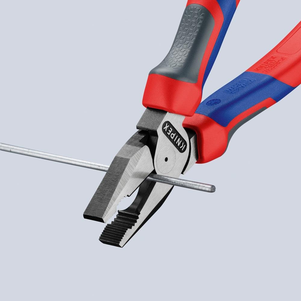 Kraft-Kombizange 35 % Kraftersparnis gegenüber herkömmlichen Kombizangen. Mit Schneiden (Härte ca. 63 HRC) für den harten Einsatz. Leichteres Arbeiten durch optimierte Übersetzung. Leichter schneiden, kraftvoll greifen, biegen und ziehen. Lange Schneiden für dickere Kabel. Mit Greifzonen für Flach- und Rundmaterial für vielseitigen Einsatz. Präziser, minimaler Lichtspalt zwischen den Greifbacken, der die optimale Funktion der Schneiden sicherstellt. Schneiden zusätzlich induktiv gehärtet, Schneidenhärte ca. 63 HRC. Mit Comfort-Griffen: aus drei ergonomischen Komponenten für optimierte Handhabung und mit zwei KNIPEXtend-Schnittstellen für Erweiterungen. - Schneidwerte harter Draht (Durchmesser): Ø 2,5mm - Schneidwerte Pianodraht (Durchmesser): Ø 2,0mm - Schneidwert Cu-Kabel, mehrdrähtig: Ø 11,5mm - Schneidwert Cu-Kabel, mehrdrähtig: 16,0mm²