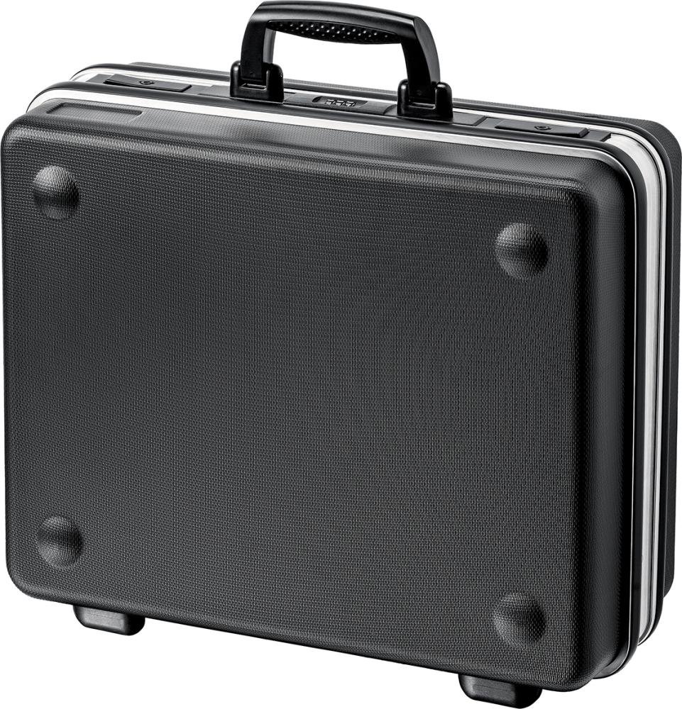 E Werkzeugkoffer "Basic" Insgesamt 41 Steckmöglichkeiten. max. Zuladung: 15 kg. 27 Liter Fassungsvermögen. Stabiler, ergonomischer Tragegriff. Strapazierfähige Ausführung aus ABS-Material, schwarz. Umlaufender Aluminiumrahmen. Metallscharniere. Dokumentenfach im Deckel. Zwei herausnehmbare Werkzeugtafeln aus schmutzabweisenden PP-Hohlkammerplatten mit 21 bestückbaren Werkzeugtaschen. Bodenschale, per Druckknopf fixierbar, Höhe 50 mm, durch Einsätze weiter unterteilbar und Abdecktafel mit zwölf großen Werkzeugtaschen und einem Flachfach. Zwei Metall-Kippschlösser und dreistelliges Zahlencodeschloss zum sicheren Verschließen des Deckels. Beschriftungsfeld mit zwei Aufklebern zur individuellen Kennzeichnung. - Abmessung Breite außen (innen): 465mm 440mm - Abmessung Höhe außen (innen): 200mm 180mm - Abmessung Tiefe außen (innen): 410mm 350mm / 350mm