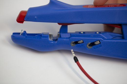 | Keyfacts: | Abisolieren und Crimpen mit nur einem Werkzeug I Abisolieren von 0,5 mm² bis 6,0 mm² I Zwei Crimpbereiche (0,5 - 2,5 mm² und 4,0 - 6,0 mm²) nach DIN 46228-2 I Integrierter, gut zugänglicher Seitenschneider bis 6 mm² |
