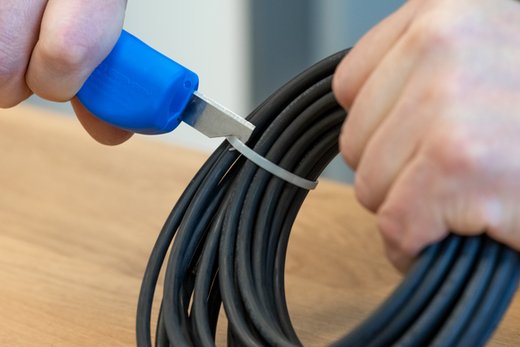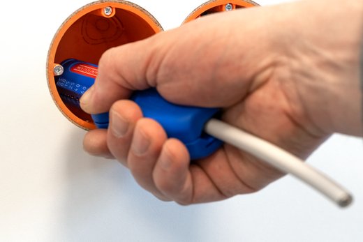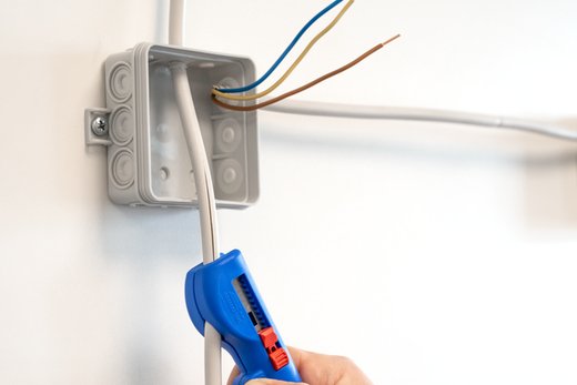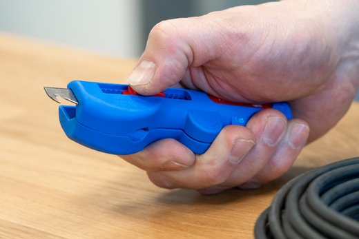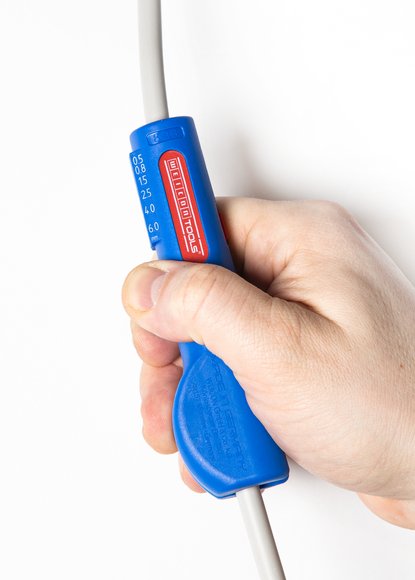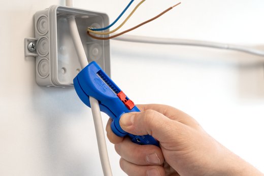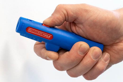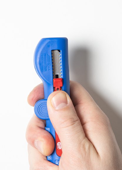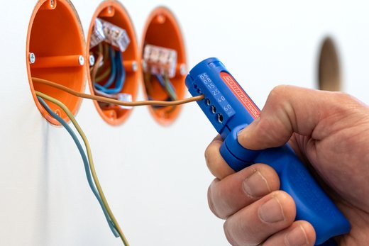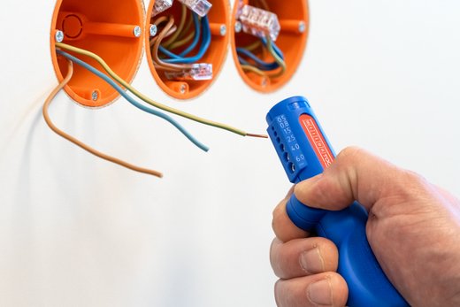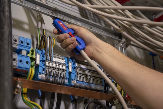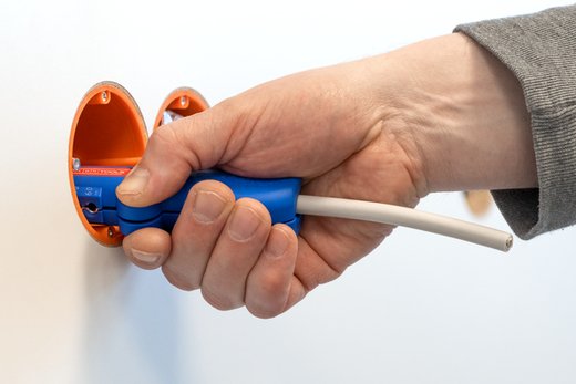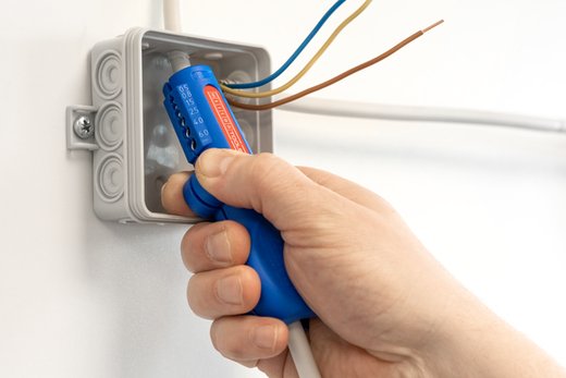 Auch an schwerzugänglichen Stellen oder in Abzweig- und Verteilerdosen können Kabel mit dem Werkzeug bündig abgemantelt und abisoliert werden.