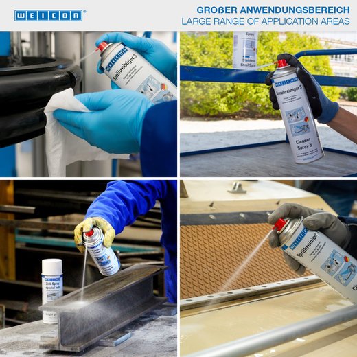 Er kann zur Reinigung und Entfettung vor dem Grundieren und Lackieren, zur Reinigung von Maschinenteilen oder vor dem Auftragen anderer WEICON Produkte auf Oberflächen eingesetzt werden, wo ein fettiger Untergrund deren Wirkung beeinträchtigen würde.