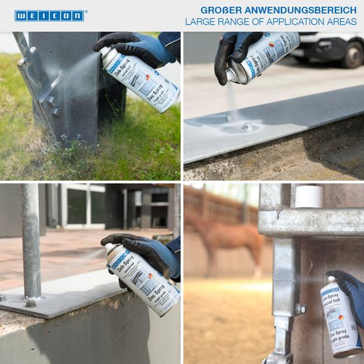 WEICON Zink-Spray spezial hell ist TÜV-geprüft, verleiht dauerhaft allen Metalloberflächen einen kathodischen Korrosionsschutz und hat einen hellen Farbton, der einer frischen Feuerverzinkung angeglichen ist.