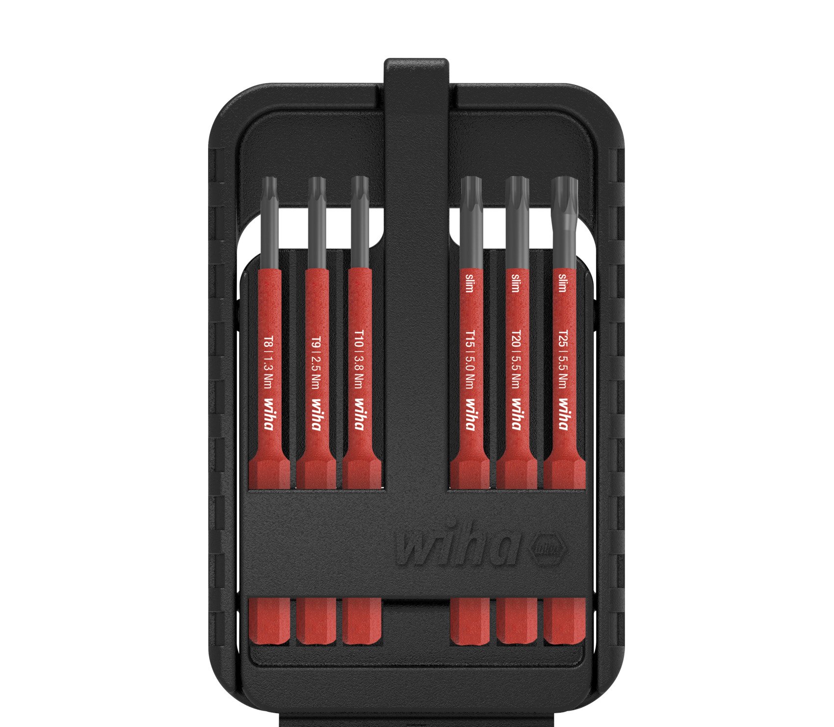 Um tiefliegende Schrauben erreichen zu können, ist der Klingendurchmesser bei herkömmlichen Elektrikerschraubendrehern häufig zu groß. Das Entfernen der Isolierung ist jedoch unzulässig und gefährdet zudem die eigene Sicherheit. Bei der speziell für elektrische Anwendungen entwickelten Wiha slimTECHNOLOGY wurde die Schutzlisolation in die Klinge intergriert, um bis zu 33% schlankere Klingen zu ermöglichen. So können mit den slimBits auch tiefliegende Schraub- und Federelemente mühelos erreicht werden. Die isolierten slimBits werden gemäß der internationalen Norm IEC 60900 einer Stückprüfung unterzogen und ermöglichen ein sicheres Arbeiten im Bereich von spannungsführenden Teilen bis 1.000 V AC. Zudem sind die slimBits in einer smarten Bitbox verstaut, welche eine optimale Einsicht auf die Schraubprofile gewährt. Die 6 mm slimBits sind nur im speedE®, slimVario® oder TorqueVario®-S electric Werkzeugen zu verwenden.