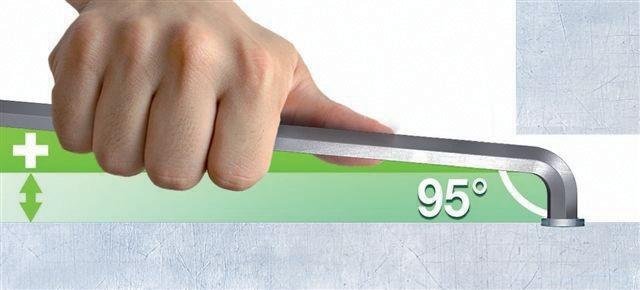 Extra: Erhöhung des Handarbeitsraumes von über 30% und somit Reduzierung des Verletzungsrisikos der Fingerknöchel und -kuppen durch 95° Biegung des Stiftschlüssels. Bessere Zugänglichkeit durch Reduzierung der Stiftschlüsselkopfhöhe um bis zu 15%.