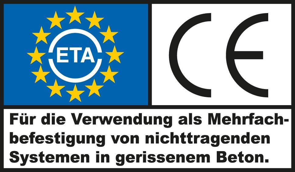 • Zugelassen für Beton C12/15 bis C50/60, gerissen, für die Verwendung als Mehrfachbefestigung von nichttragenden Systemen